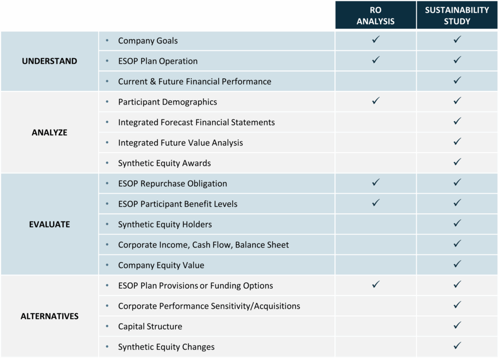 A Repurchase Obligation (RO) Analysis provides a forecast of ESOP distributions and participant benefit levels based on static financial and value assumptions. Other capital claims such as synthetic equity or debt instruments are not considered, nor are the impacts to future value of the RO itself.